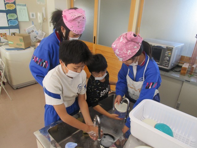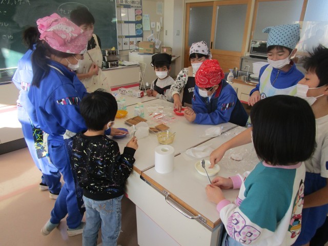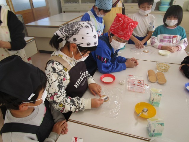 1,2組合同でクリスマスビスケットケーキを作りました。大きい子が小さい子の面倒を見ながら作ることができ、とてもうれしそうでした。お店のケーキもおいしいけれど、自分たちで作ったケーキは特別ですね。