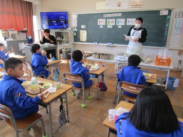 今日は給食センターの栄養士さんに食品に入っている【カルシウム】について教えてもらいました。牛乳の中には、他の飲み物よりもたくさんの【カルシウム】が入っていることに気づき、驚いていました。そして、いつもよりも給食を一生懸命食べることができました。
