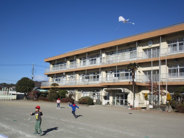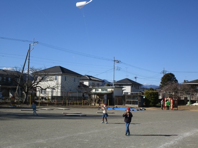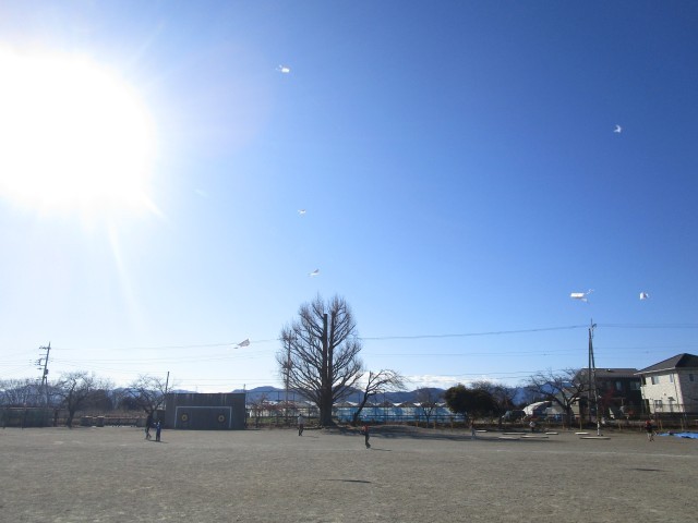 図工で作った「たこ」をあげています。空気は冷たいのですが風が少しあって、ちょうどよく「たこ」があがっていきます。青い空に1年生の世界に一つだけの「たこ」があがり、みんなうれしそうです。ぜひお家でも「たこあげ」、やってみてください。