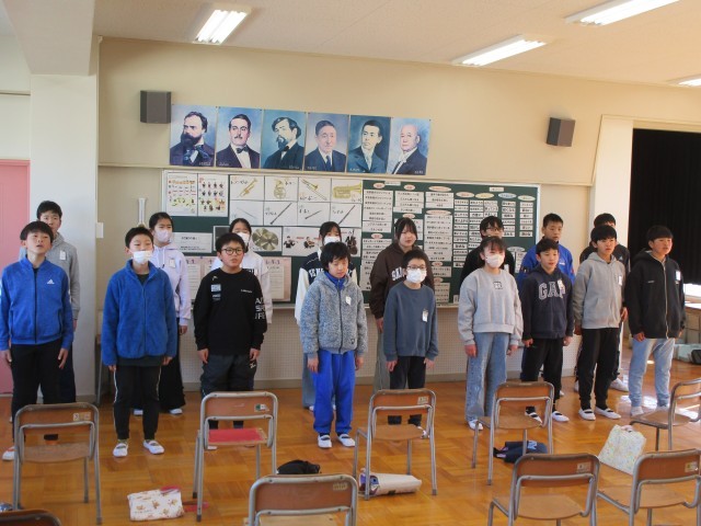 卒業式で歌う歌の練習をしています。どんな気持ちをこめて歌うのか、どんな姿で歌うのか、そこが大切だということを聞き、真剣に取り組んでいる様子が見られました。卒業式が楽しみです。6年生、期待していますよ。