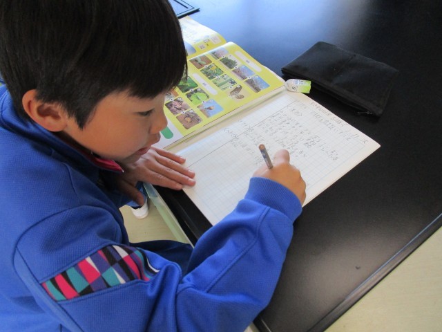 1年間の生き物のようすを教科書の写真を見て考えていました。春夏秋冬のサクラやかまきりなどの変化をあらためて知り、校庭のサクラの木を見て、「いまは冬で春になったら、ピンクになるね」と言っていました。
