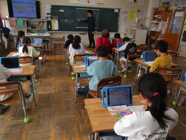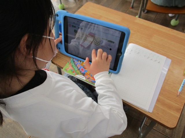 文章からどんな答えになるか予想しています。まずは図を書いて、目で見て確かめました。今日は3つの数字を使って式を立てたので少し難しかったようですが、よく集中してがんばりました。