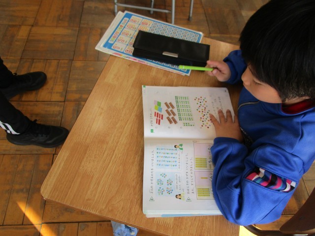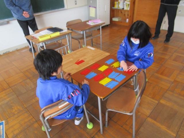 【10のまとまりをつくって大きい数をかぞえよう】が今日のめあてです。たくさんある数え棒を10本ずつに分け、数えるとよいことに気づきました。2人で協力して数え、正しい答えを出すことができました。