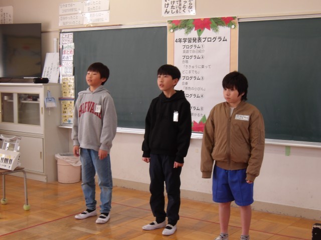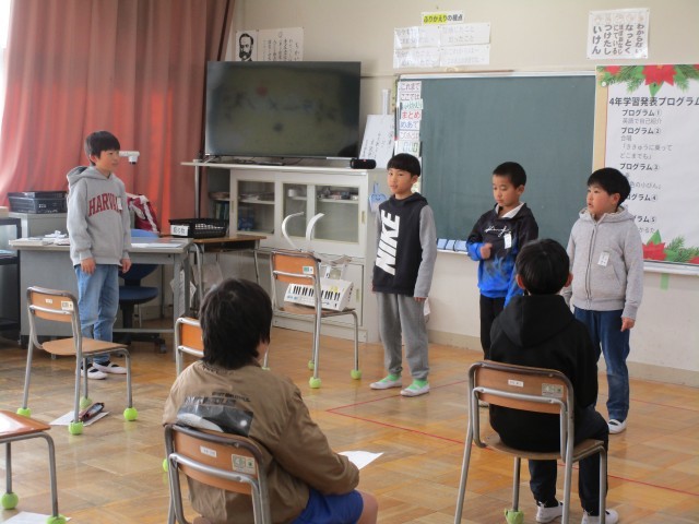 1年間の成長を見てもらうためにみんなで話し合って発表内容を決めました。群読では読む順番を工夫したり、英語の自己紹介ではALTの先生に見てもらい、アドバイスをもらったりなど本番を迎えるまでにもたくさんのがんばりが見られた4年生です。