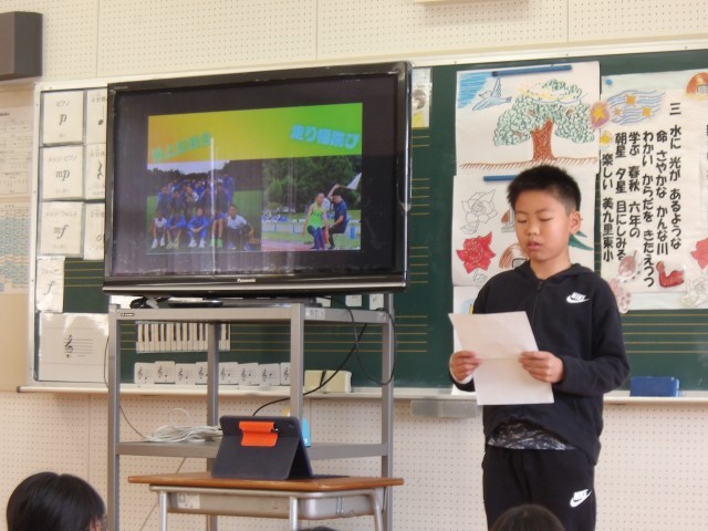 大きな声で歌うことから始まりました。その後は一人ひとりスライドを使いながら発表をしました。この1年をふり返って、自分ががんばったことやこの後もがんばりたいことをしっかりとした態度で伝えることができました。