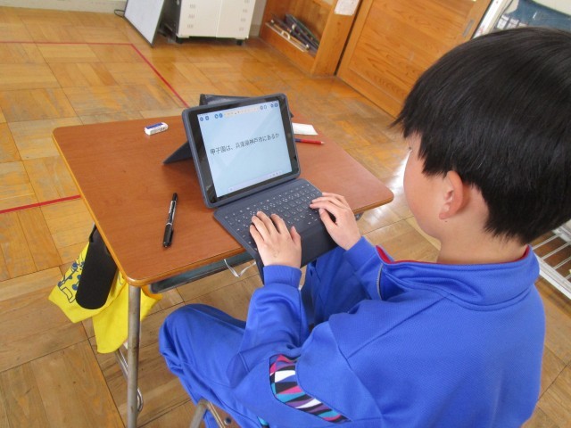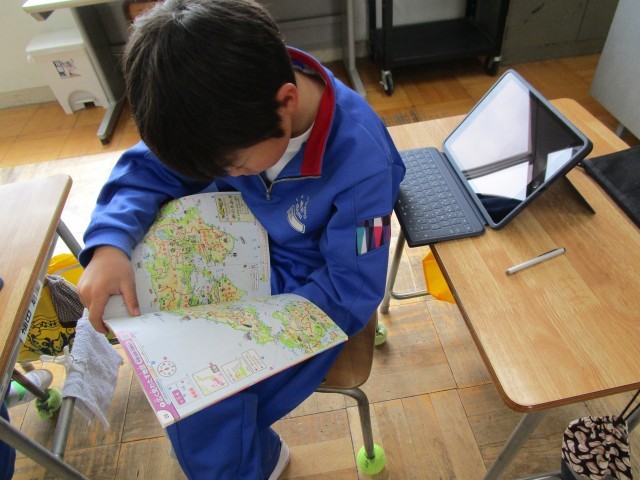 「都道府県クイズ」を作っています。日本を6つに分け、担当を決めました。地図を見たり、ネットで調べたりしながら、都道府県の特徴を探しています。ロイロノートを使ってスムーズに作業をしている4年生です。