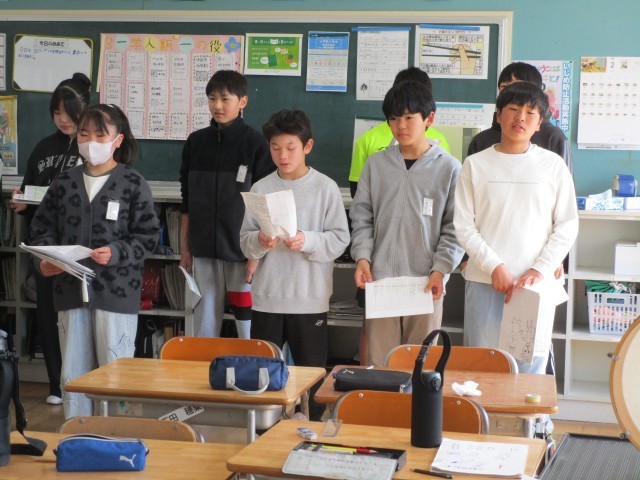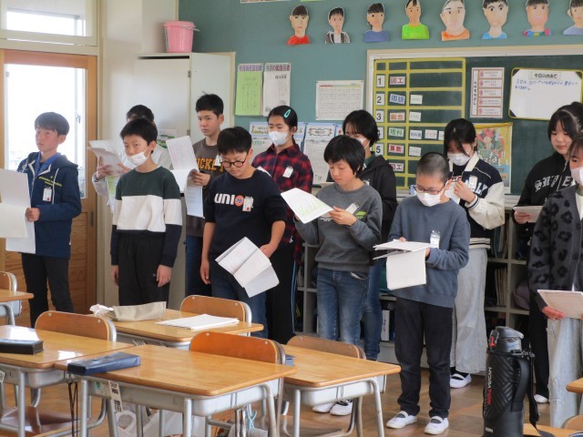 卒業式まであと15日となり、6年生は先週から呼びかけの練習を始めました。それぞれの分担が決まり、自分のセリフをきちんと覚えて言うことがまず大切なことです。そして、全体の流れを覚えることもしないと、自分のセリフは言えません。大きな声で、立派な態度で、気持ちを合わせて、卒業式に向かっていけるとよいですね。