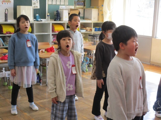 音楽の時間に【卒業式】の歌や呼びかけの練習をしました。大きな口を開けて大きな声で歌っています。呼びかけも自分たちが担当する言葉を順番にリズムよく言うことができました。1年生はいつでも全力で取り組めるところが、とてもよいところです。
