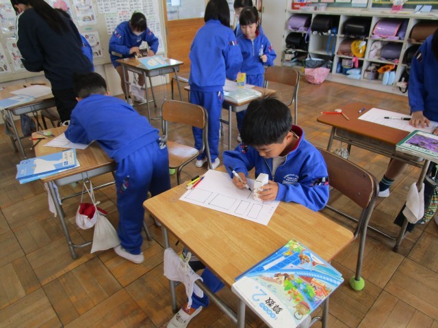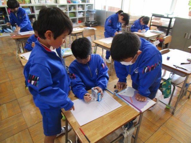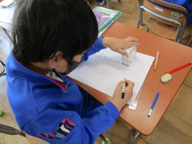 【はこの形】の学習をしています。これから箱を自分で作るにあたって、面の形と数を知ることが必要です。今日はお家から箱を持ってきて面の形と数の確認をしました。なかなか写し取る作業が難しかったようです。自分の箱ができるようにがんばりましょう。