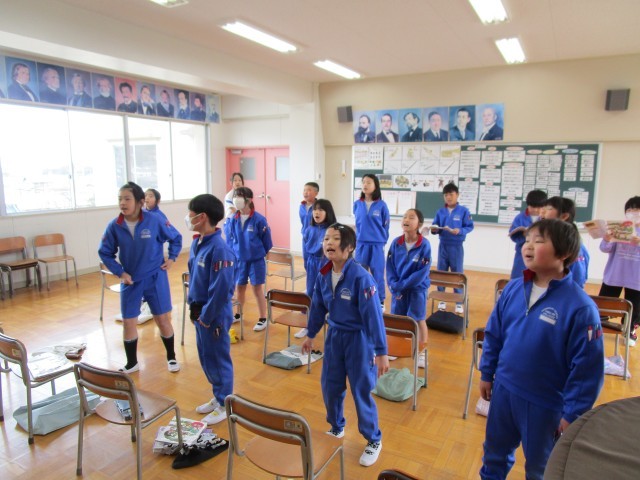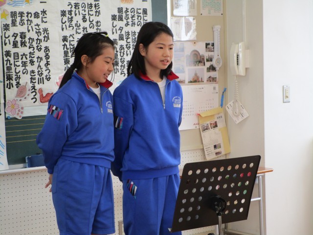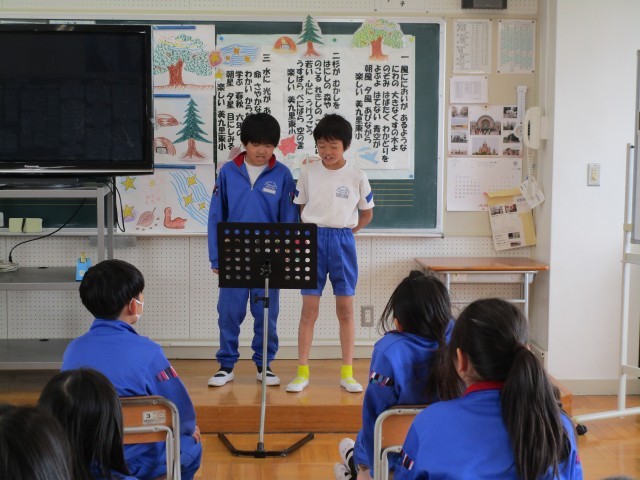 とても楽しそうな歌声が響いてきました。音楽室をのぞいてみると3年生が元気よく【パフ】を歌っています。みんなで歌った後は2人組になり、全員の前で自信満々に発表しました。