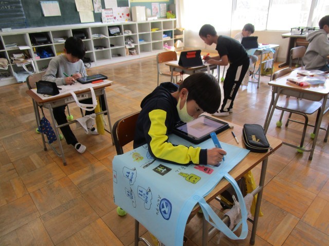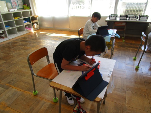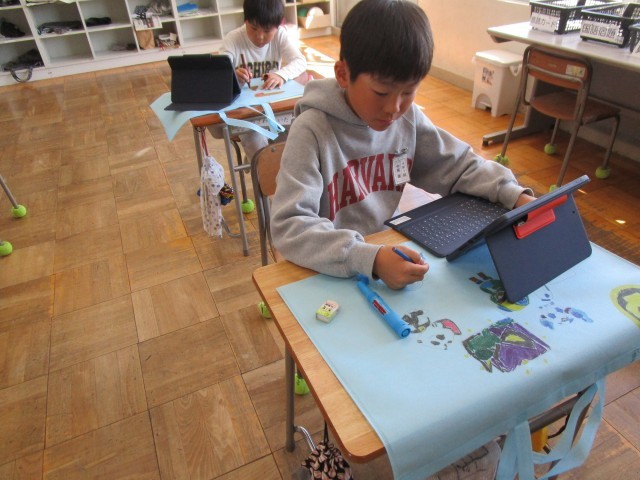 お隣の4年生も同じく作品バッグ作りをしていました。こちらもタブレットで調べて、お気に入りを描いています。お絵かきは子どもたちにとって、とても楽しい作業のようです。