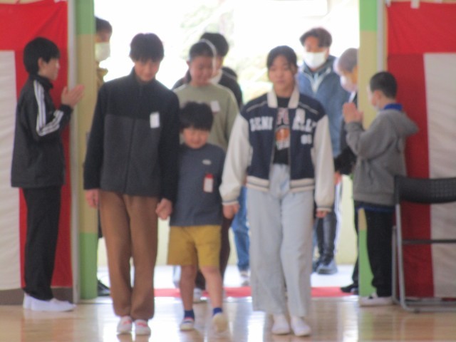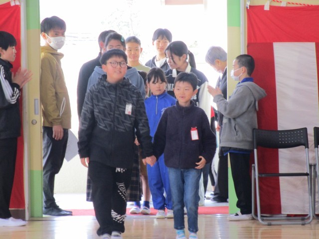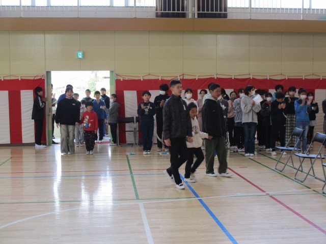 最後の卒業式練習が終わり、【6年生を送る会】を行いました。かわいい1年生と6年生が入場です。