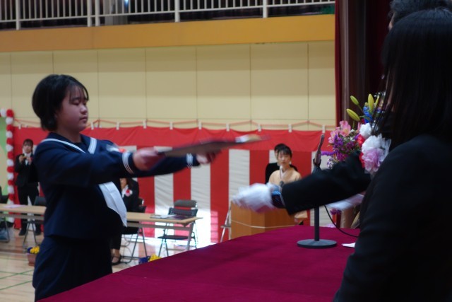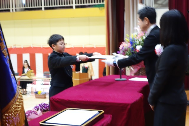 【卒業証書授与】一人ひとり大きくはっきりとした声で返事をし、校長先生から卒業証書をもらいました。