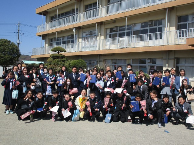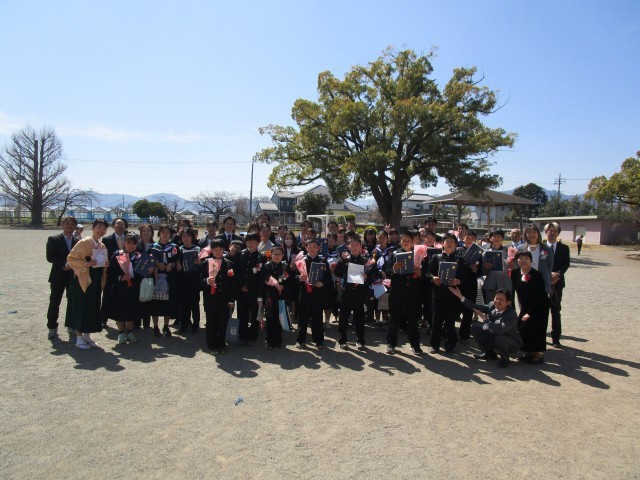 在校生が作ったアーチの中を通って6年生は巣立っていきました。最後に保護者の方と一緒に最後の記念写真です。校舎とくすのきの前でパシャリ!笑顔の花が満開です。