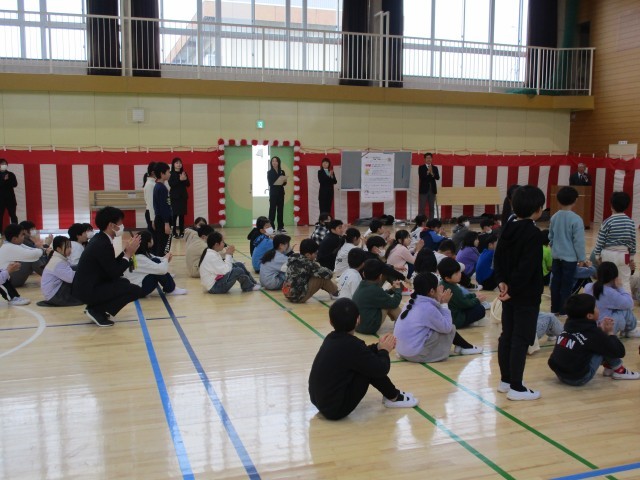 漢字・計算コンテストの満点賞の発表です。がんばった東小っ子が立って、みんなから賞賛されました。
