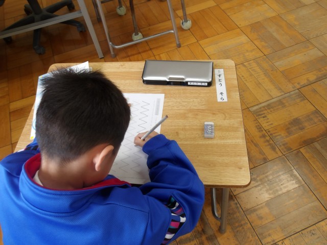 入学をして4日目。教科書を開いて、鉛筆を持って学習が始まりました。鉛筆の持ち方を習い、今日は曲線や直線を書く練習プリントに取り組みました。仕上がったときの子どもたちのうれしそうな表情が印象的です。