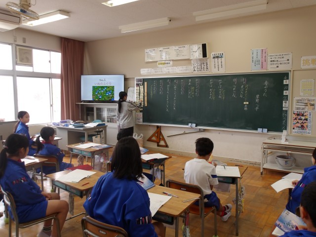 「春のうた」という詩の学習に取り組みました。春の植物の画像でイメージを膨らませ、さらに詩で表現されている言葉をもとに発想を広げ、自分が感じたことをそれぞれ発表をしました。