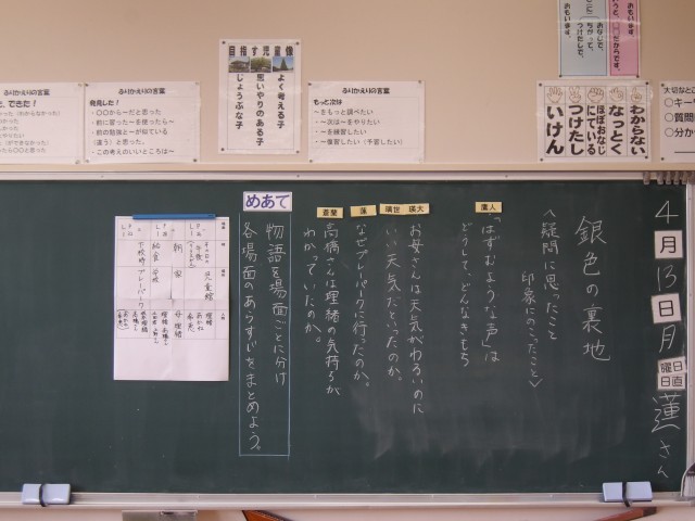 物語文「銀色の裏地」の学習を進めています。本時は、物語文を読んでそれぞれが疑問に思ったことなどを出し合い、学習課題を考えました。課題を解決するために場面ごとのあらすじをとらえてまとめました。今後の学習を楽しみにしている子どもたちの姿が印象的でした。