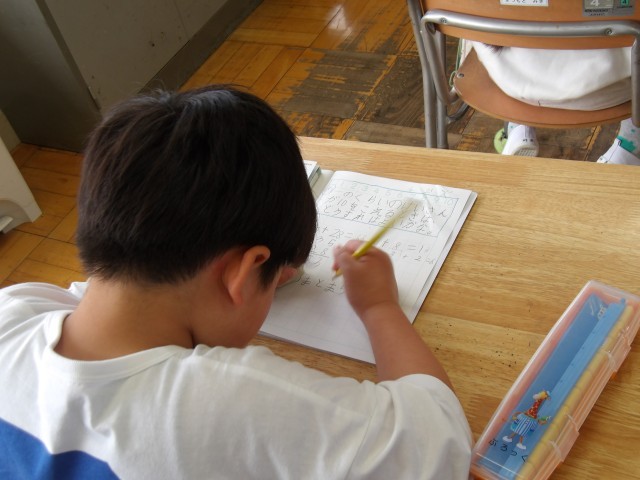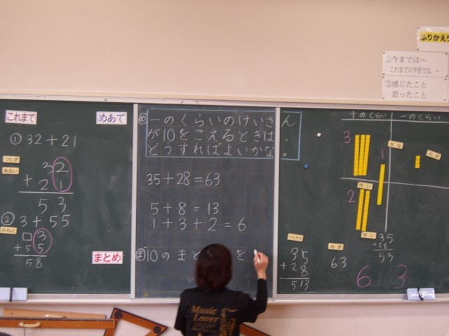 「一の位の計算が10をこえるときは、どうすればよいのか」をめあてに学習を行いました。ブロック図を活用することを通して、一の位の計算が10より大きくなるときには、十の位に繰り上げることを学び、正確に解くことができました。