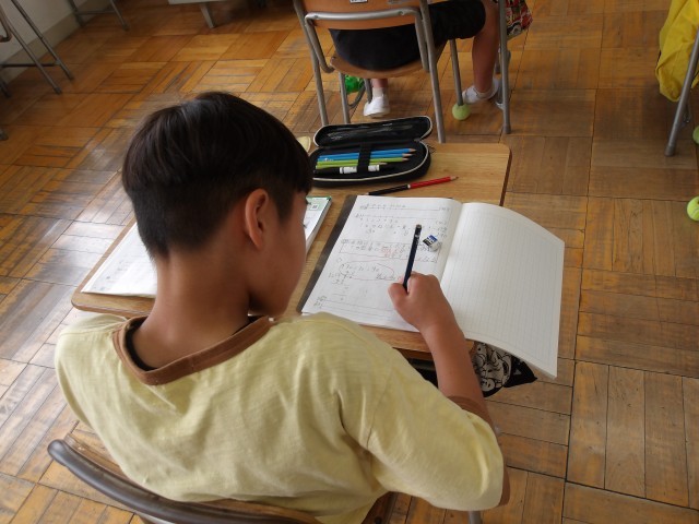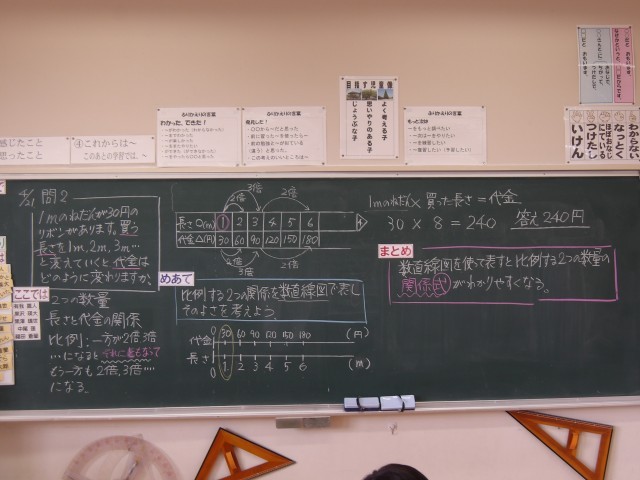 代金の変わり方を考える問題に取り組みました。ともなってかわる2つの量の場合、その関係を数直線を活用してあらわすと関係式がわかりやすくなることに子どもたちは気付きました。正確に問題を解くための数直線の書き方について理解することができました。