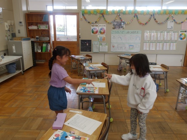 「あいさつげんきに」というお話を話をもとに、あいさつの大切さのについてみんなで考えました。いつ、どんなあいさつをしているか、身近なあいさつを振り返り、実際あいさつを交わし合うとどのような気持ちになるか、みんなでゲームを通して体感しました。