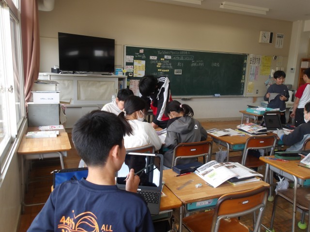 「平和主義とは何だろう」をめあてに学習を行いました。教科書に出てくるキーワードについて、各自インターネット等を活用して調べました。プリントにまとめる際には、調べてわかったことを、低学年にわかりやすく伝えるためにはどのような表現がよいかを考えてまとめました。友だちと考えを伝え合いながらわかりやすくまとめようとがんばる姿が印象的でした。