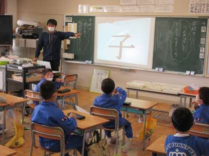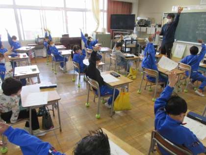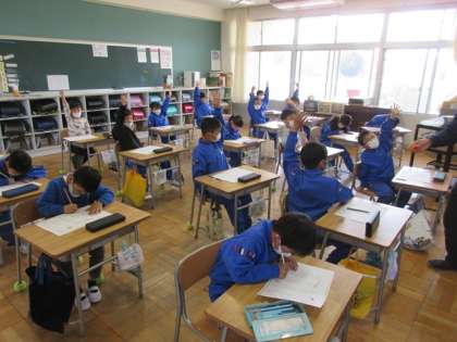 2年生も一校時めは国語です。「文をつくろう」の単元です。教師の問いかけに手がたくさん挙がります。