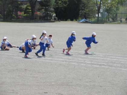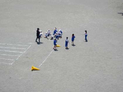 2年生は校庭で体育の授業です。風が少し強かったので、コーン等が飛んでいきそうでしたが、負けずに頑張っていました。50m走の学習でした。