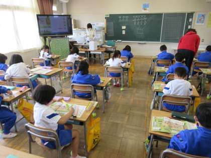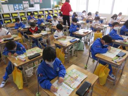 1年生は教室で算数の学習でした。数の学習で、算数セットのおはじきを使って仲間づくりをしていました。