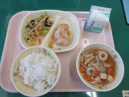 今日の給食は「ごはん・牛乳・鶏肉のゴマダレかけ・けんちん汁・おひたし」のメニューです。けんちん汁は鎌倉の建長寺が発祥の地ということはあまりにも有名です。今日もおいしくいただきました。