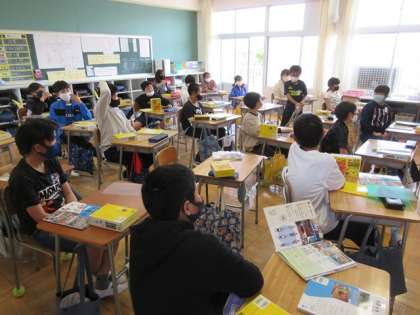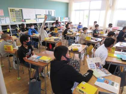 6年生は社会の時間で、「日本国憲法」について学んでいました。よく手があがります。よく見るとハンドサインを使っています。