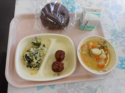 「ココアパン・牛乳・肉団子・ジャガイモのバター煮・ほうれん草サラダ」のメニューです。ココアパンは子どもたちにも人気があります。ジャガイモがとてもおいしく煮てありました。