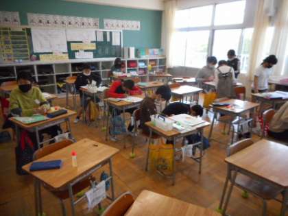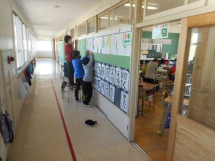 6年生は図工「想像の翼を広げて」で、6年生になった今の心の中をイメージして表現する作品づくりを行っていました。出来上がった作品を廊下に展示していました。