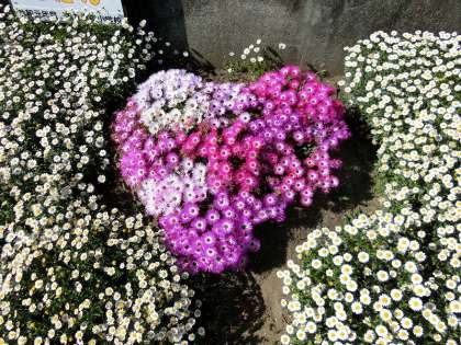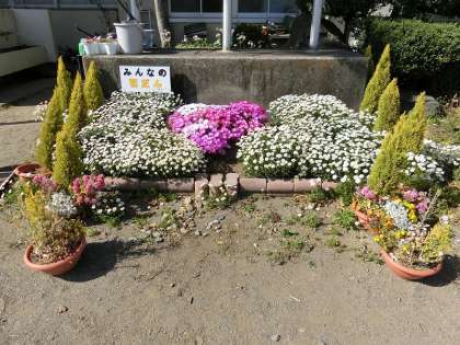 「みんなの花だん」が、花盛りです。児童たちの花だんですが、業務員の岩崎さんがとても気を配ってくださり、今年もこんなにも見事な美しいハートがお目見えしました。本校一番の名所です。