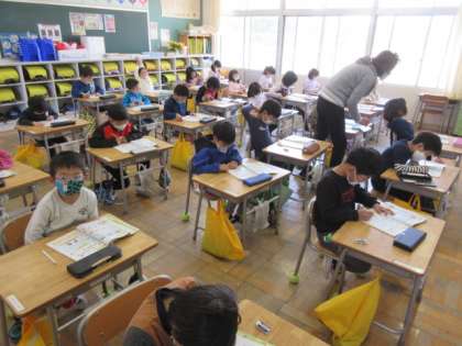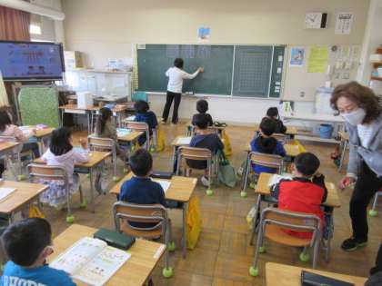 1年生は算数の授業でした。数の大きさ比べをしていました。二つの数でどちらがきいか、みんな大きな声で答えを言えていました。