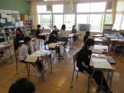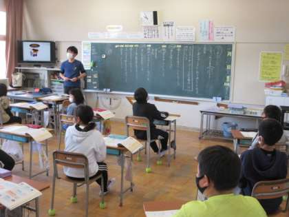 5年生は道徳の授業です。「シンボルマークに込められた思い」という郷土愛について学習する内容でした。最後には 美九里東小のシンボルマークをみんなで考えていました。