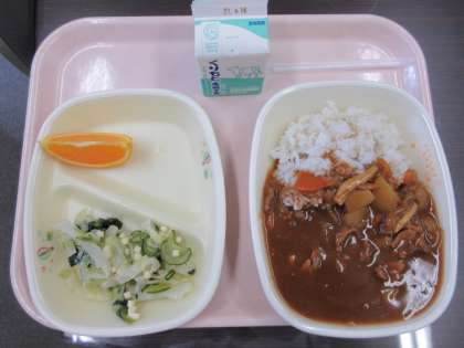 「麦ごはん・牛乳・ハヤシライス・チーズサラダ・オレンジ」のメニューです。ハヤシライスはカレーライスと同じでご飯がたくさん食べられます。チーズサラダは小ぶりの賽の目状に切ったチーズがアクセントになりおいしくいただけました。