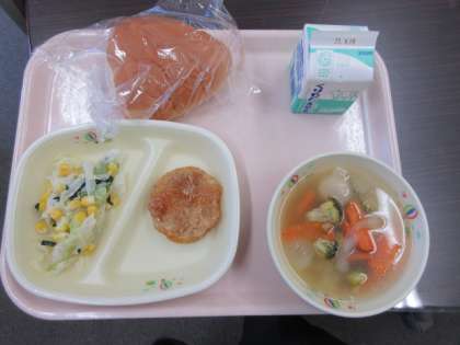 今日は「パーカーハウス・牛乳・鶏肉にのマーマレードソースかけ・いかボールスープ・コーンサラダ」のメニューです。チキンバーガーにしておいしくいただきました。