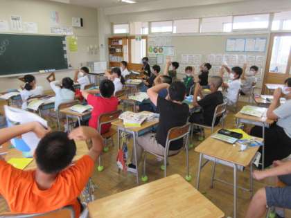 6年生の社会科です。歴史分野の学習で、縄文時代から弥生時代への変化について学習していました。子どもたちも言いたいことがたくさんある様子で、活発な発言が見られました。