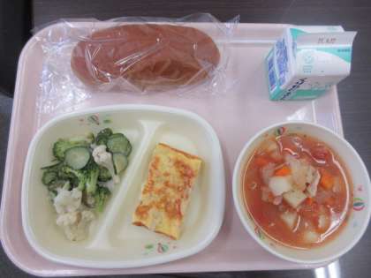 「黒パン・牛乳・野菜とチーズの卵焼き・ミネストローネ・花野菜サラダ」の欧風田舎料理といった感じのメニューでした。