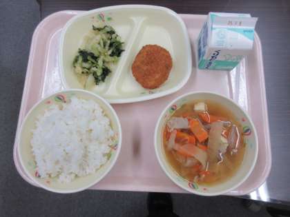 「ごはん・牛乳・かぼちゃのひき肉フライ・豚汁・アーモンド和え」のメニューです。フライは、具に味が付いておりソースは不要で、かぼちゃの甘みを感じることができました。アーモンド和えは、アーモンドの香ばしさがにじみ出ており、食物繊維も豊かな体にも良いメニューです。全体的に見て豚汁定食のような感じでよかったです。