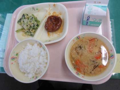 「ごはん・牛乳・鶏つくね・もずくのかきたま汁・アーモンド和え」のメニューです。もずく料理は沖縄でよく食べられているものです。きっと夏バテに効果があるのかもしれません。