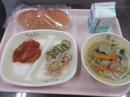 「ロールパン・牛乳・鶏肉のバーベキューソース・野菜たっぷりスープ・大根とツナのササラダ」のメニューでした。スープやサラダは野菜のうまみがよく出ていて、野菜を摂取しやすいように調理してありました。