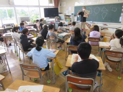4年生の図工の授業です。これから木工の「ギコギコトントン」という教材を作る最初の話でした。