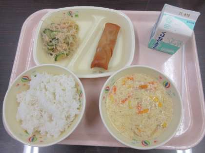「ごはん・牛乳・春巻き・中華コーンスープ・バンバンジーサラダ」の中華メニューです。バンバンジーはごま油の香りが立っておいしかったです。