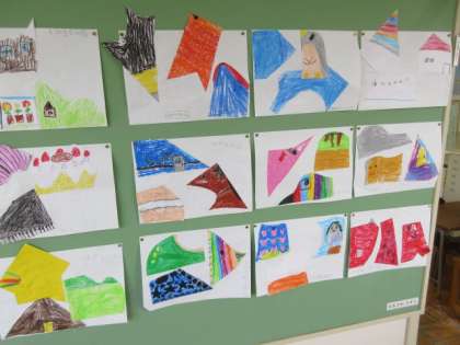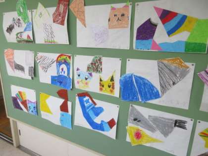 1年生の廊下に紙からはみ出したおもしろい絵が貼ってありました。