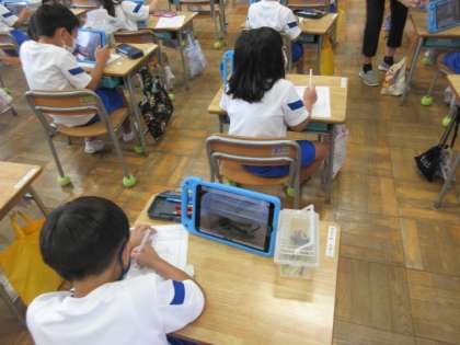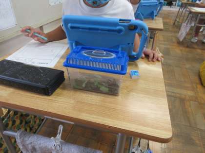 1年生の生活科の授業です。「いきものとなかよし」の単元で、秋の生物(バッタ)について、タブレットで写真を撮り、観察記録に絵と文章で書きました。
