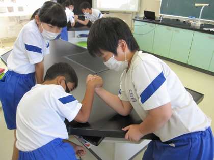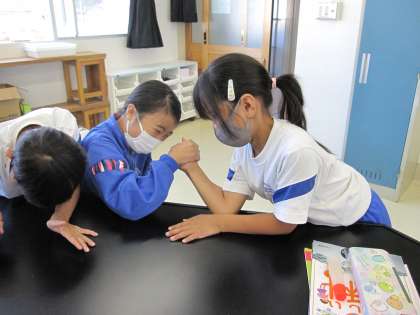 うでずもうをすると、うではひじのところで曲がりました。うでにはかたいしんのような部分(ほね)と、やわらかくて力を入れるとかたくなる部分(きん肉)があることに気づきました。