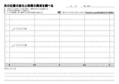 今日の午後7時頃と午後8時頃に月の位置(方位と高さ)を調べてワークシートに記録させてください(教科書P103〜106参照)。「わかったこと」も自分なりの考えで書かせてください。21日に観察できなかった場合、22日以降で観察してください。夜の観察なので、保護者の方のご協力をよろしくお願いします。