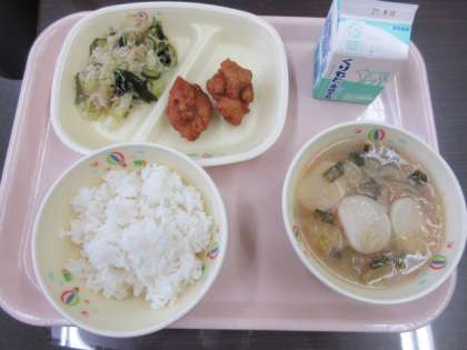 「ごはん・牛乳・鶏のから揚げ・トックスープ・カルシウムサラダ」のメニューです。今日の給食は、「体力アップメニュー」と銘打ってあり、体作り(筋肉・骨)に欠かせない「炭水化物」「タンパク質」「カルシウム」などが強化されています。トックスープとカルシウムサラダは新メニューでもあります。トックとは朝鮮半島の餅の一種で、トックスープは韓国料理です。日本でいえば、お雑煮のようなものでしょうか。(違うという反論もあるかもしれませんが・・)出汁が効いていておいしかったです。カルシウムサラダは揚げた小魚(シラスか・・)が入っていて、じゃこサラダのような深い味が出ておいしかったです。今日の給食を完食すれば、きっともりもりの体になることでしょう!!
